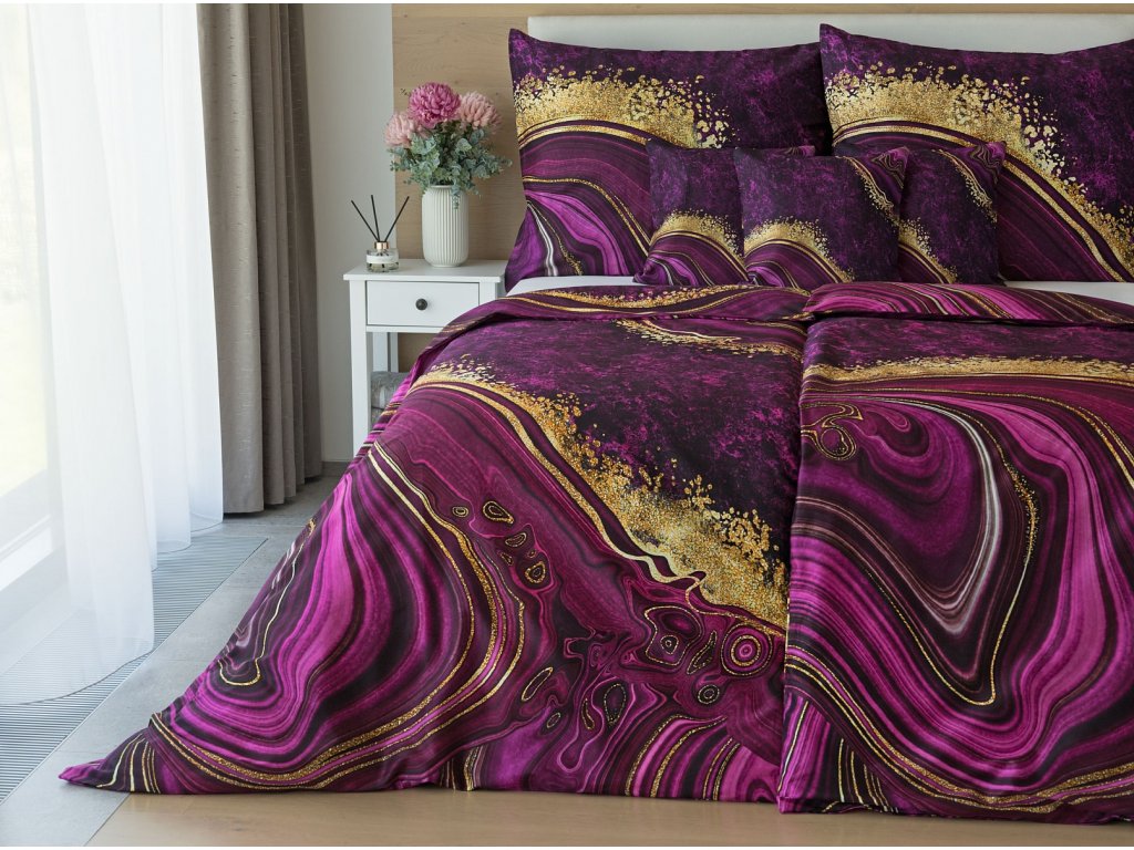 Obměna velmi oblíbeného modrého povlečení Iris, ložní set Ramada, potěší všechny milovníky zářivě růžových tónů. Abstraktnímu vzoru dominují odstíny malinově růžové, fuchsiové a ostře fialové barvy, které v abstraktním vzoru zdobí zlatavé prvky.